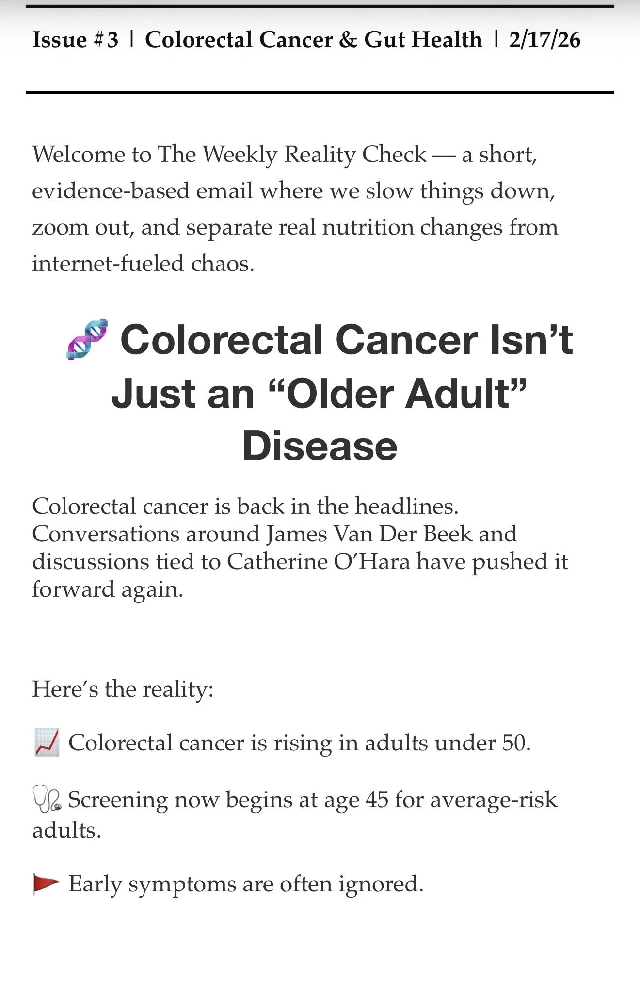 The Weekly Reality Check Feb 17 Written By Chase Merfeld Issue #3 | Colorectal Cancer & Gut Health | 2/17/26 Chase Merfeld https://www.chasingyourhealth.com